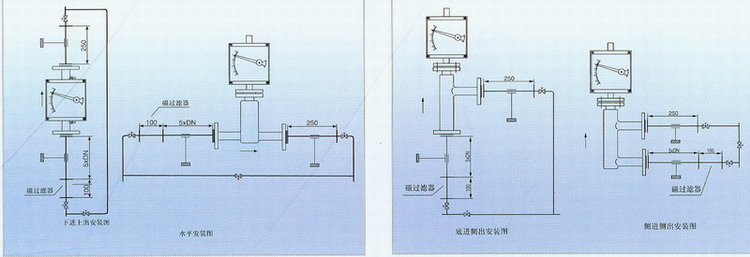浮子流量計應垂直安裝,流量計中心線與鉛垂線的夾角不超過5°。在累計的上游須保證五倍公稱通徑的入口直管段,下游保證250mm出口直管段。如果介質中含有固定雜質,應在流量計上游加裝過濾器,如果介質中含有鐵磁性物質,應在流量計的上游安裝磁過濾器。為了便于維護和清洗且不影響,建議安裝旁通管路。